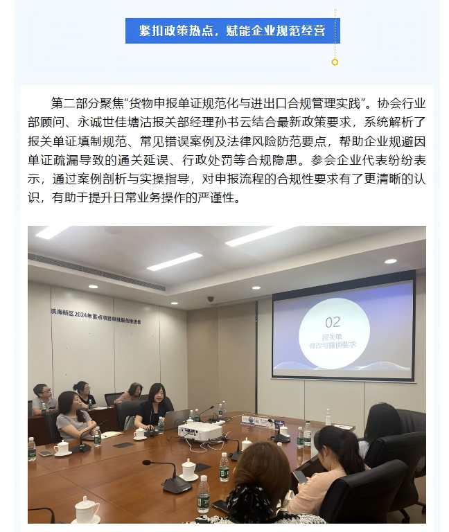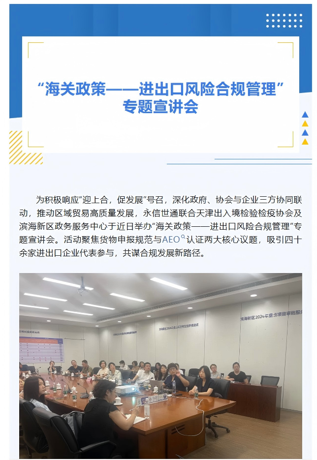 永信世通聯(lián)合天津出入境檢驗檢疫協(xié)會及濱海新區(qū)政務(wù)服務(wù)中心舉辦“海關(guān)政策——進(jìn)出口風(fēng)險合規(guī)管理”專題宣講會